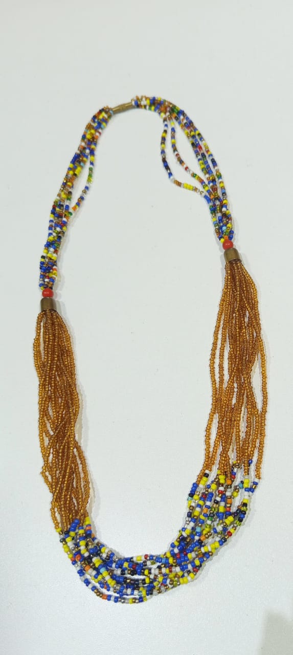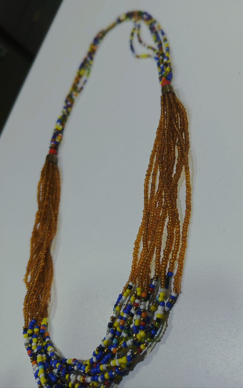 Handcrafted from vibrant glass beads, this multicolor African necklace blends warm amber strands with bold blue, yellow, white, and red accents. Each piece is uniquely made, celebrating African artistry and culture. Lightweight, versatile, and perfect for statement styling or gifting.